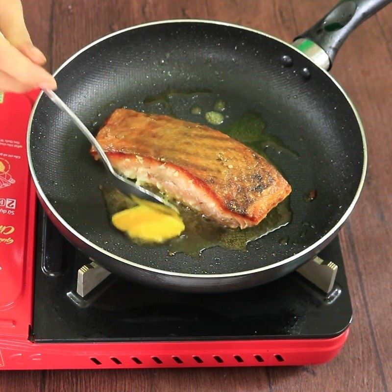 Tiếp theo, bạn hãy ướp cá với một chút muối, tiêu, để trong 3 phút để cá ngấm hương vị. Kế tiếp, sử dụng chảo chống dính và đun nóng dầu oliu và cho cá vào áp chảo. Sau 2-3 phút bạn hãy lật mặt cá để cả hai bên chín đều. Khi này bạn hãy cho thêm chút bơ và gừng để món ăn có hương vị đậm đà hơn. Khi cá đã vàng đều, hãy gắp ra đĩa.