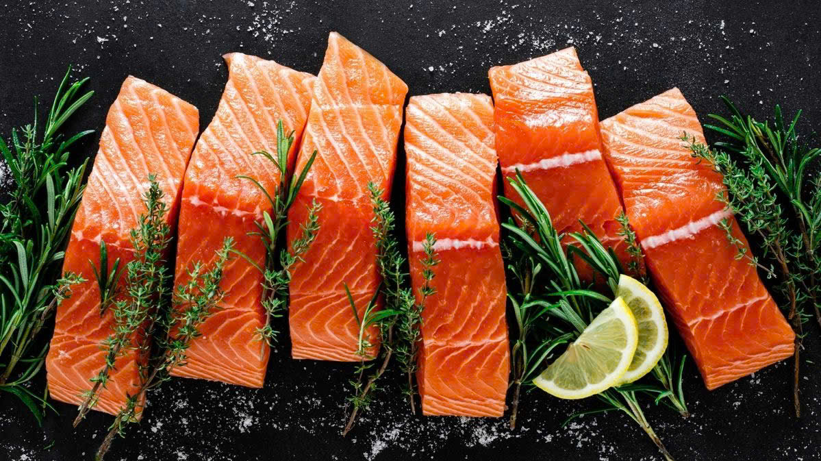 - Cá hồi phi lê: 200–250g mỗi phần, tươi, vân mỡ đều.