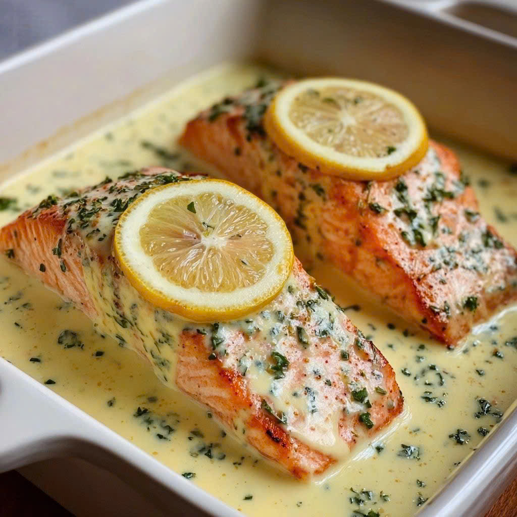 Sự kết hợp nguyên liệu này mang đến món cá hồi mềm mượt, sốt kem chanh thanh nhẹ và béo tinh tế, phù hợp bữa tối sang trọng ngay tại nhà.