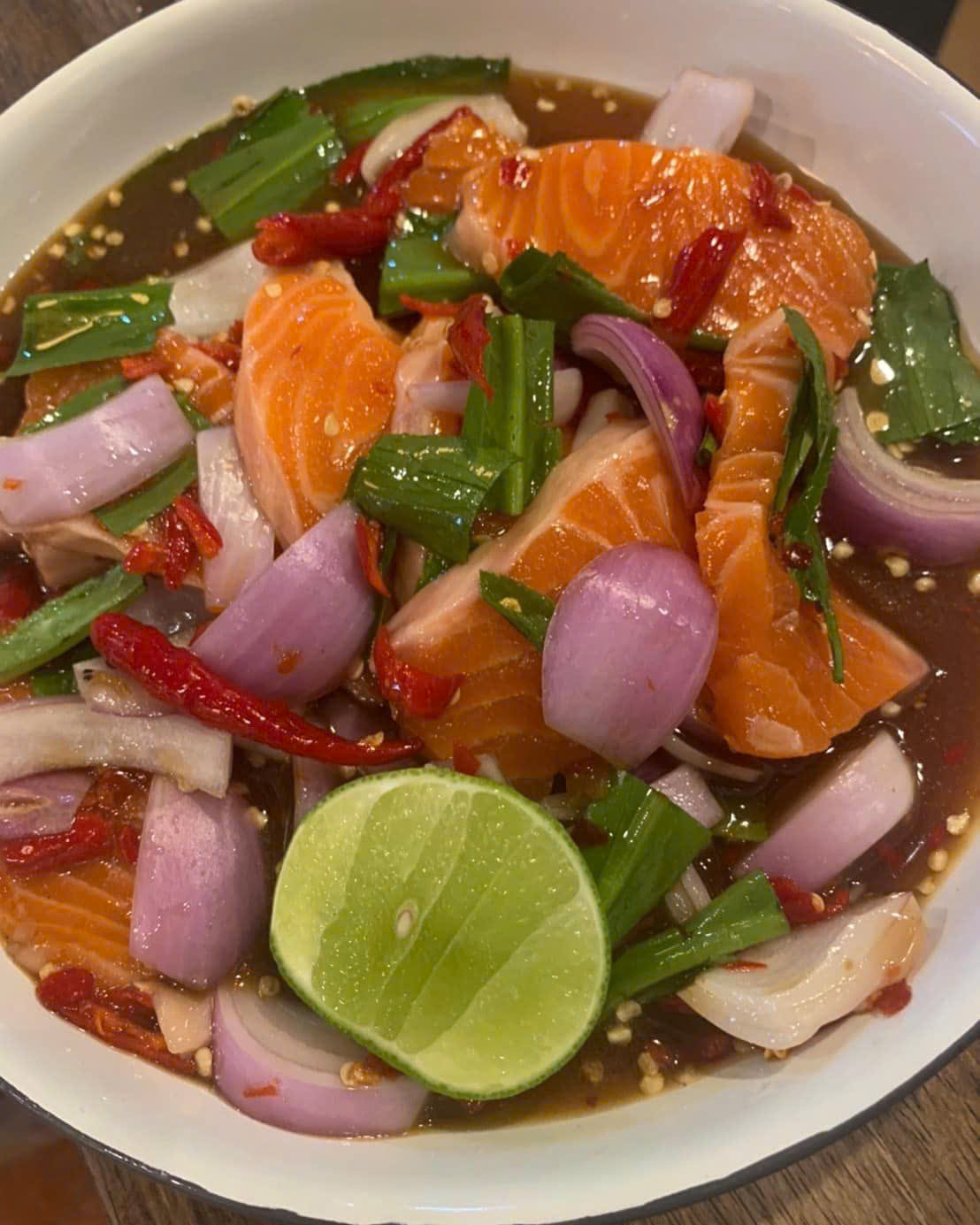 Khi trộn với sốt, phần mỡ cá tan nhẹ trong miệng, hòa cùng vị chua của chanh, cay của ớt, mặn của nước mắm và ngọt của đường thốt nốt, tạo nên cảm giác “bùng vị” rõ rệt. Đây chính là yếu tố khiến cá hồi sốt Thái trở thành món ăn dễ gây nghiện.