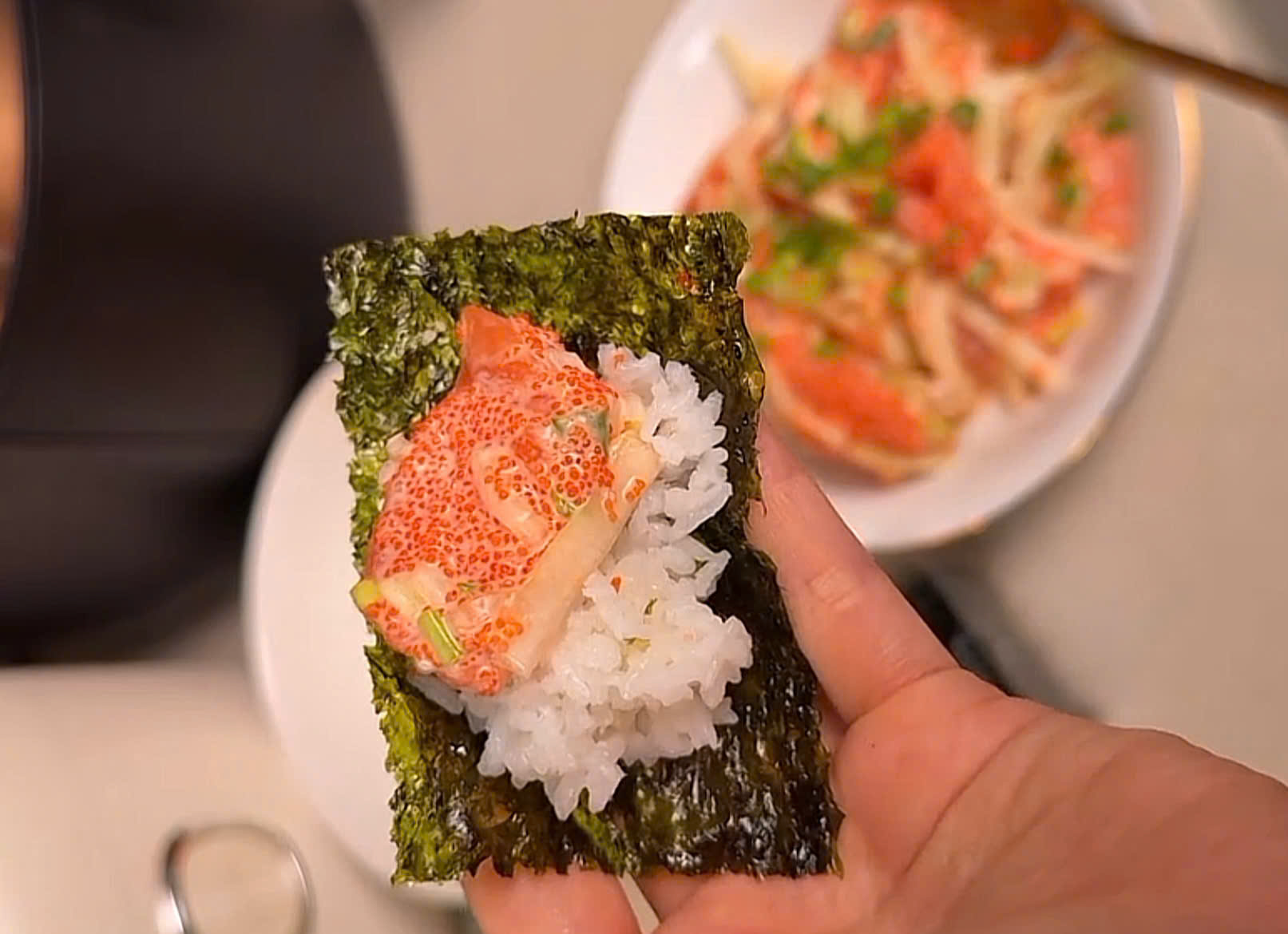 Hương vị và trải nghiệm Cá hồi mềm, mọng, hòa quyện cùng vị béo của sốt mayonnaise, vị giòn giòn, mặn nhẹ từ trứng cá tạo nên trải nghiệm ăn uống thú vị. Khi kết hợp với rong biển, món ăn sẽ có thêm hương thơm, không bị tanh và tăng phần thẩm mỹ. Hương vị cân bằng, vừa miệng, khiến món ăn trở nên dễ ghiền, phù hợp làm snack tại nhà, món ăn nhẹ, hoặc topping cho salad, cơm, bánh mì.