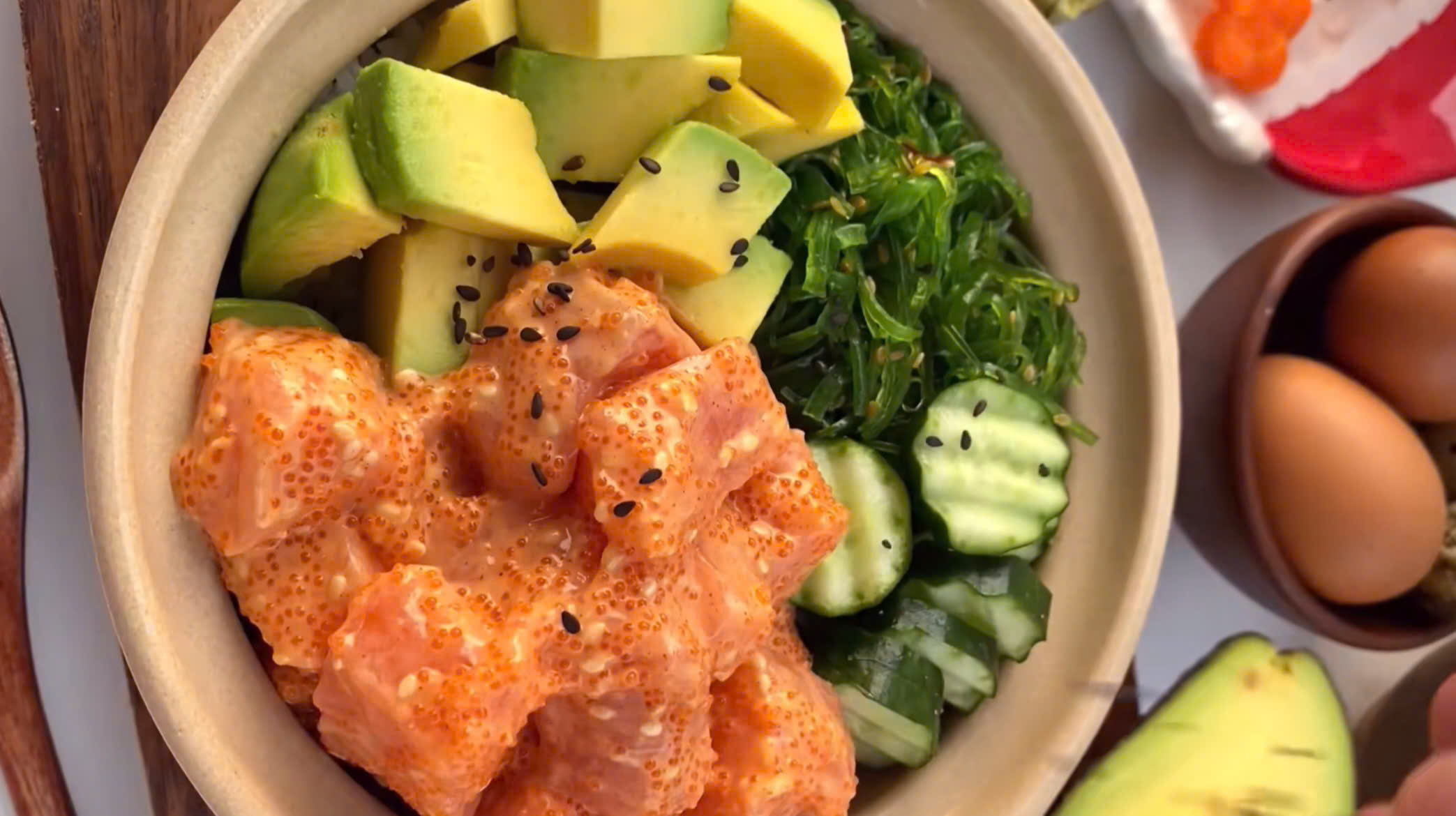 - Trứng cá: tùy chọn loại trứng cá hồi, trứng cá chuồn hoặc trứng tôm, khoảng 50–100g.