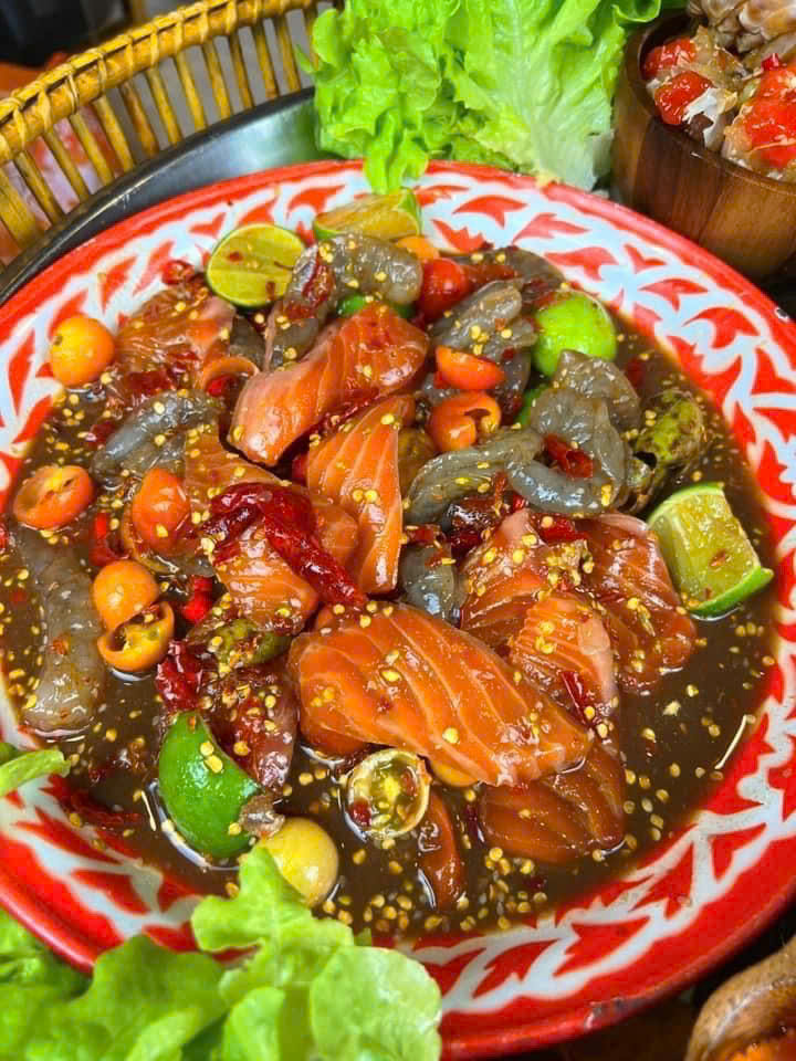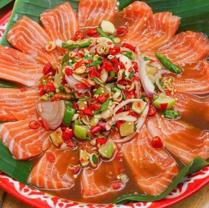 Chính hàm lượng chất béo tự nhiên cao kết hợp với kết cấu thịt mềm, mướt đã giúp cá hồi trở thành nguyên liệu lý tưởng cho các món ăn mang vị chua cay. Vị béo ngậy của cá có khả năng cân bằng hoàn hảo với vị cay nồng của ớt, vị chua của chanh, vị mặn của nước mắm và vị ngọt của đường, tạo nên tổng thể hài hòa, dễ ăn và rất dễ “ghiền”. Đây cũng là lý do cá hồi sashimi thường được ưu tiên lựa chọn cho các món trộn sốt Thái.